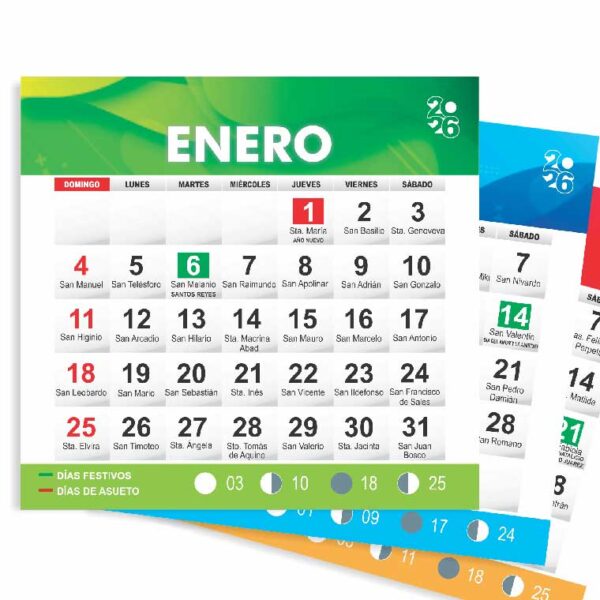 12 hojas desprendibles con Santoral, días de asueto y festivos.
